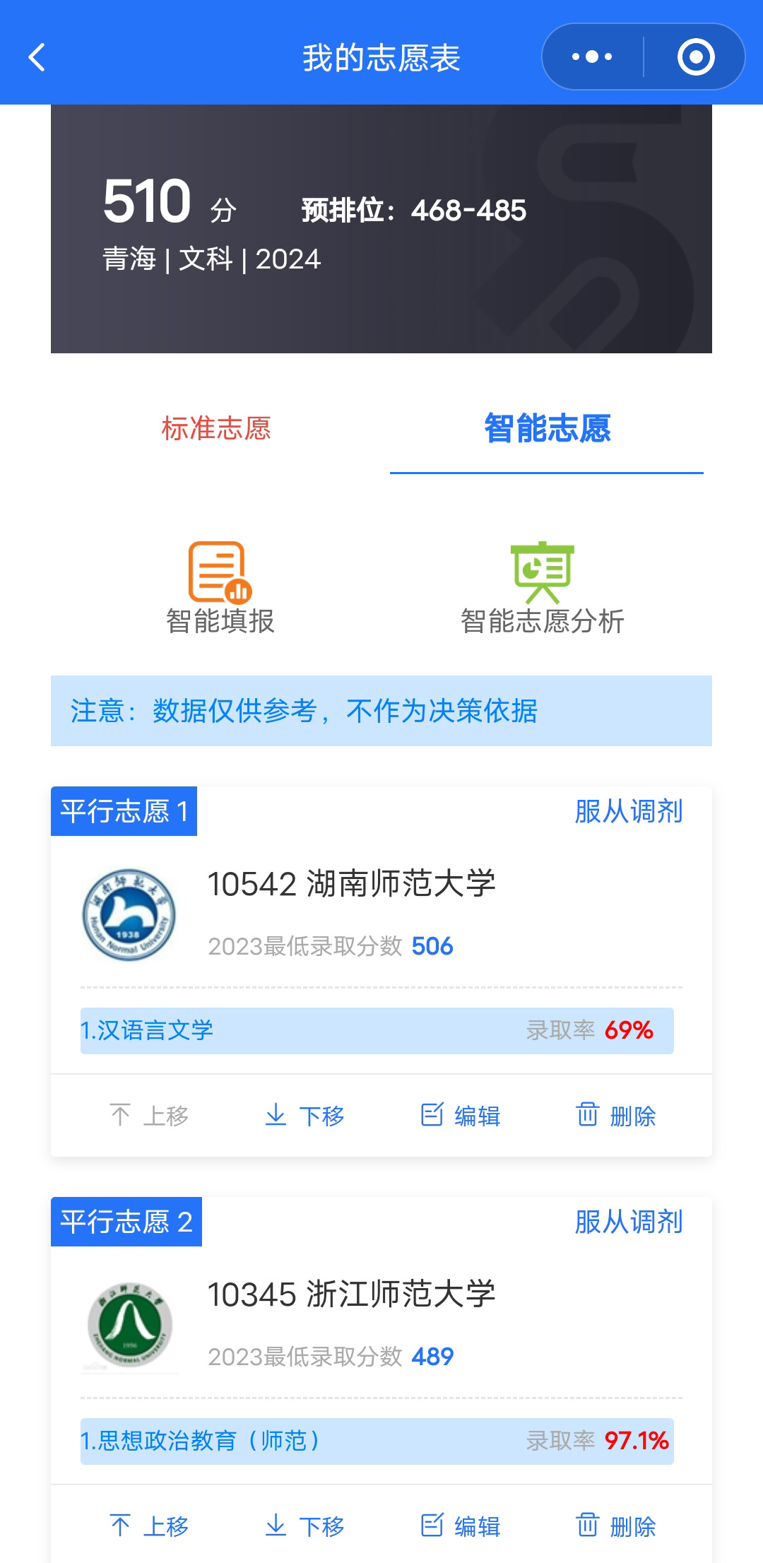 根据用户输入的预估高考分数(或实际高考分数),对历年青海招录院校和专业进行大数据分析,最后按用户输入的院校地区以及想读的专业,给出精准的推荐,期中包含:冲击,稳妥,保底三个档次,推荐的院校可以按照地区,层次,院校性质进行分类,让用户对自己的目标院校一目了然,有的放矢!模拟志愿填报后还会给出详细的志愿分析报告,方便用户更深入了解自己想入读院校的招录情况!